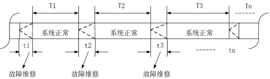 (1)可靠性,指某一時間段內(nèi)設(shè)備或系統(tǒng)連續(xù)運行而無故障發(fā)生的概率。重要表征參數(shù)是平均無故障時間(Mean Time Between Failure,簡稱MTBF)是指相鄰兩次故障之間的平均工作時間,也稱平均故障間隔時間。如圖1所示MTBF= ,系統(tǒng)故障率λ= 1/MTBF。
