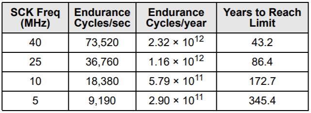 FeRAM存儲器具有讀取和還原機制。因此,對于存儲陣列的每次訪問(讀取或?qū)懭耄瑢葱惺┘幽途弥芷凇?FRAM體系結(jié)構(gòu)基于每個64位的16K行的行和列的陣列。整個行在內(nèi)部訪問一次,無論是讀取還是寫入一個字節(jié)或全部八個字節(jié)。在耐久性計算中,該行中的每個字節(jié)僅被計數(shù)一次。下圖顯示了一個64字節(jié)重復(fù)循環(huán)的耐久性計算,該循環(huán)包括一個操作碼,一個起始地址和一個順序的64字節(jié)數(shù)據(jù)流。這將導(dǎo)致每個字節(jié)在整個循環(huán)中經(jīng)歷一個持久周期。即使在40 MHz時鐘速率下,F(xiàn)RAM的讀寫持久性實際上也是無限的。
