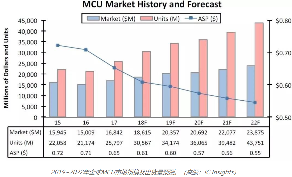 據IC Insights研究報告預測,2019年全球MCU市場規模將達204億美元、出貨量達到342億顆,不過平均售價(ASP)將持續下降。