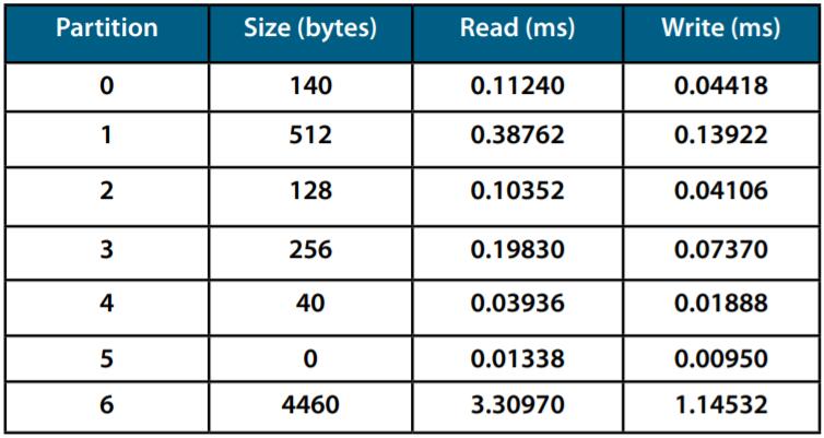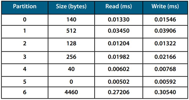 MRAM低級(jí)驅(qū)動(dòng)程序通過操作系統(tǒng)和調(diào)度程序集成到動(dòng)力總成應(yīng)用程序中。讀寫周期由系統(tǒng)時(shí)鐘(300MHz)測量。圖1&2顯示了針對(duì)動(dòng)力總成應(yīng)用的具有不同非易失性存儲(chǔ)器接口的每個(gè)分區(qū)的讀/寫時(shí)間。這些表顯示大多數(shù)讀/寫周期小于2ms。毫不奇怪,該表確認(rèn)35ns并行接口以比40MHz
