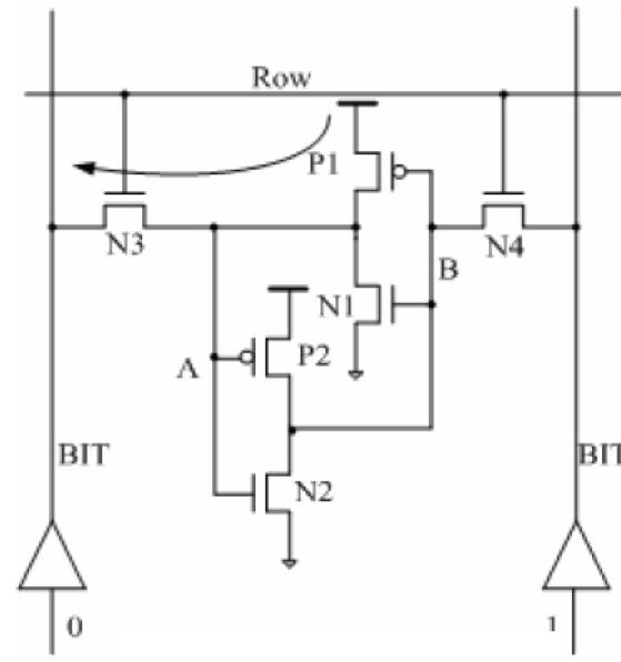 在六管單元的寫操作中,外部電路驅(qū)動兩個互補(bǔ)的信號到位線BIT 和BIT_上,字線驅(qū)動器驅(qū)動字線ROW 到高電平,位線信號經(jīng)兩個傳輸管寫入存儲節(jié)點(diǎn)。如圖3.6 所示的正是向存有“1”的單元寫“0”的情況,也就是把A 點(diǎn)的電平由VDD 下拉至GND。
