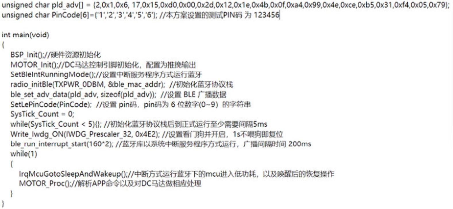 以下為主函數初始化配置內容,主要將所有的外設資源和藍牙協議棧初始化,并且以中斷服務程序的方式運行藍牙,主函數的循環中主要實現的功能為判斷是否進入低功耗模式,并且喚醒后根據接收到的藍牙數據對DC馬達進行不同的操作,代碼如下: