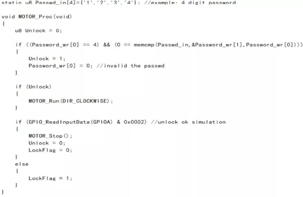 在MOTOR_Proc()處理函數中針對藍牙接收到的密碼數據進行解析,如果與默認設置的4位0-9數字密碼完全匹配上則操作解鎖,將DC馬達按照設定方向控制運轉,為了簡易驗證,模擬一個信號表示解鎖成功,這里是通過采集指定IO引腳PA1的輸入來實現,采集到輸入為高電平那么停止DC馬達轉動,且清零鎖定標志位。以下為代碼實現內容: