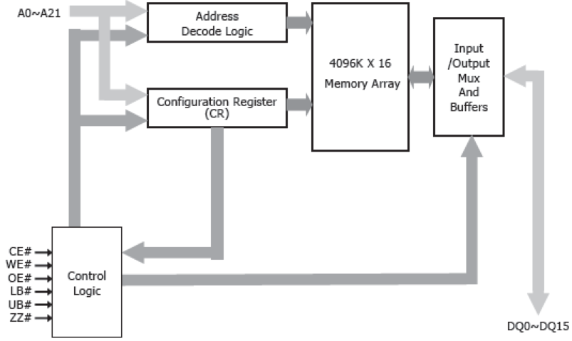 pSRAM,使用DRAM型存儲器單元,但該器件具有無刷新操作和極端低功耗技術(shù)。接口與低功耗異步類型SRAM兼容。該設(shè)備組織為4,194,304字x16位。
