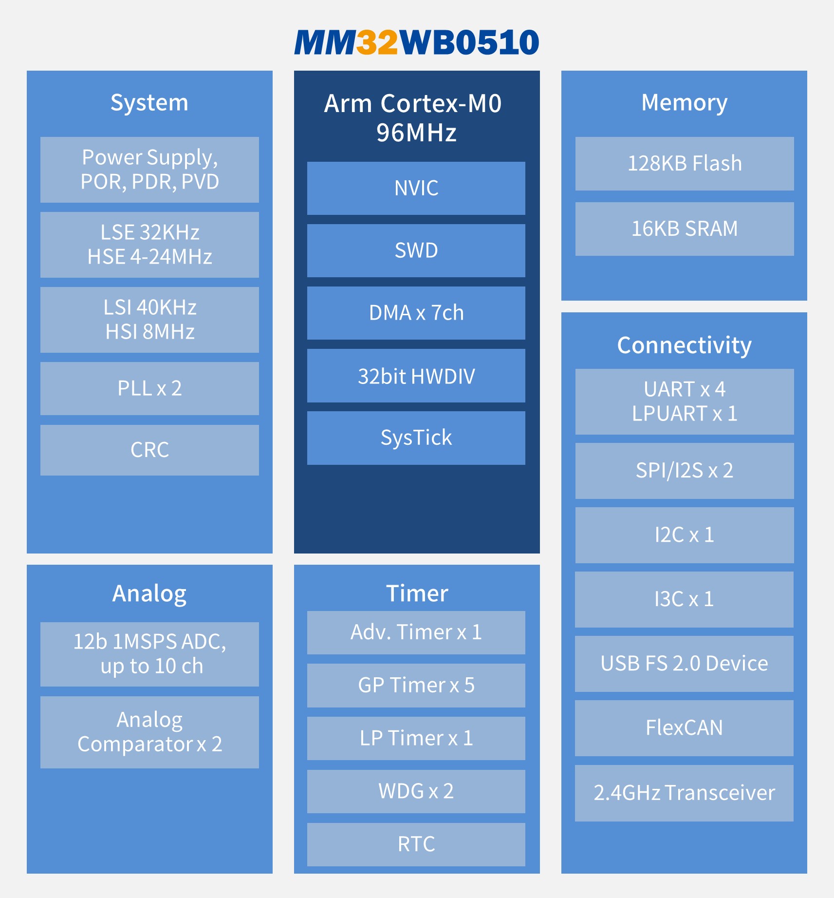 MM32WB0510搭載Arm Cortex-M0內(nèi)核,主頻可達(dá)96MHz,內(nèi)置128KB Flash和16KB SRAM,并集成了USB和FlexCAN接口,面向智能家居,鍵鼠,消防現(xiàn)場(chǎng)部件,電力電子,汽車OBU,汽車傳感器等無(wú)線和多接口類型的應(yīng)用。可選封裝形式包括:LQFP64,LQFP48,QFN48和QFN32。