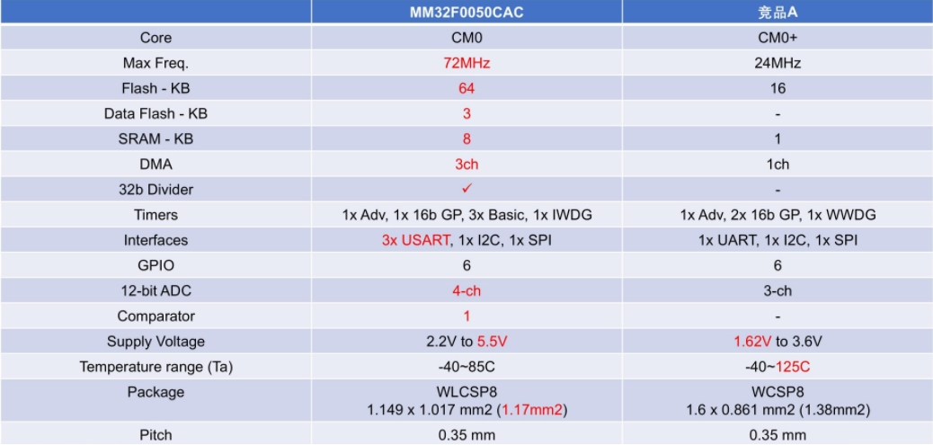 MM32F0050 WLCSP8封裝與同為WLCSP8封裝的競品A的主要參數對比: