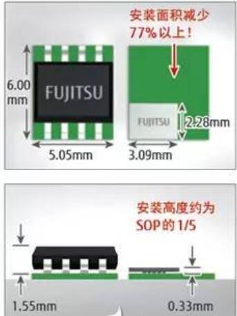 FRAM——MB85RS1MT,這是一款有8引腳晶圓級芯片尺寸封裝(WL-CSP)的產品,與傳統業界標準SOP封裝相比,此款WL-CSP大約為SOP的23%,能夠減少約77%的安裝面積。而且本WL-CSP的厚度為0.33mm,約是信用卡的一半,從安裝體積比來看,能夠減少大約95%的體積。 是