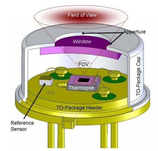 一般采用金屬外殼封裝,物料的紅外射線經(jīng)過表面的濾光片進入到里面的熱電堆電偶上,再經(jīng)過信號感應(yīng)轉(zhuǎn)換成電信號。