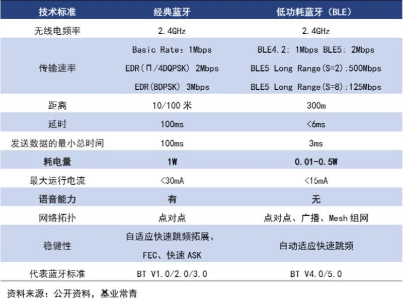 相對于經(jīng)典藍(lán)牙,低功耗藍(lán)牙芯片有傳輸遠(yuǎn)、功耗低、延遲低等優(yōu)勢。傳輸距離方面,經(jīng)典藍(lán)牙只有10-100米,而BLE最遠(yuǎn)能傳輸300米;連接方式上,經(jīng)典藍(lán)牙只能通過點對點的方式傳輸,而BLE設(shè)備能夠能通過點對點、廣播、Mesh組網(wǎng)與其他設(shè)備相連;在功耗上兩者的差別巨大,低功耗藍(lán)牙運行和待機功耗極低,使用一顆紐扣電池便能連續(xù)工作數(shù)月甚至數(shù)年之久。