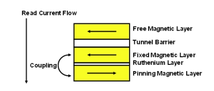 飛思卡爾半導體還通過增加兩個附加層來改進固定磁性層。在固定層下面增加了一層釕(Ru)。而在Ru層下面又增加了另一層稱為牽制層(pinning layer)的磁性層。固定層和牽制層的極性相反,將會引起很強的耦合。該強耦合使固定層的極性保持鎖定,因此不會在編程操作過程中引起誤反轉(zhuǎn)(圖4)。